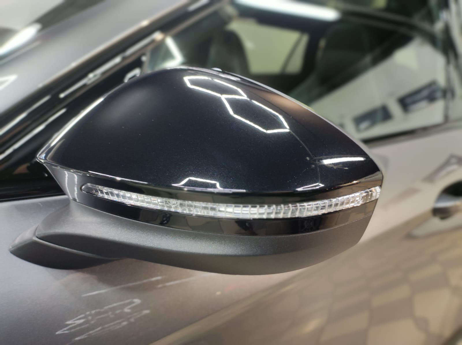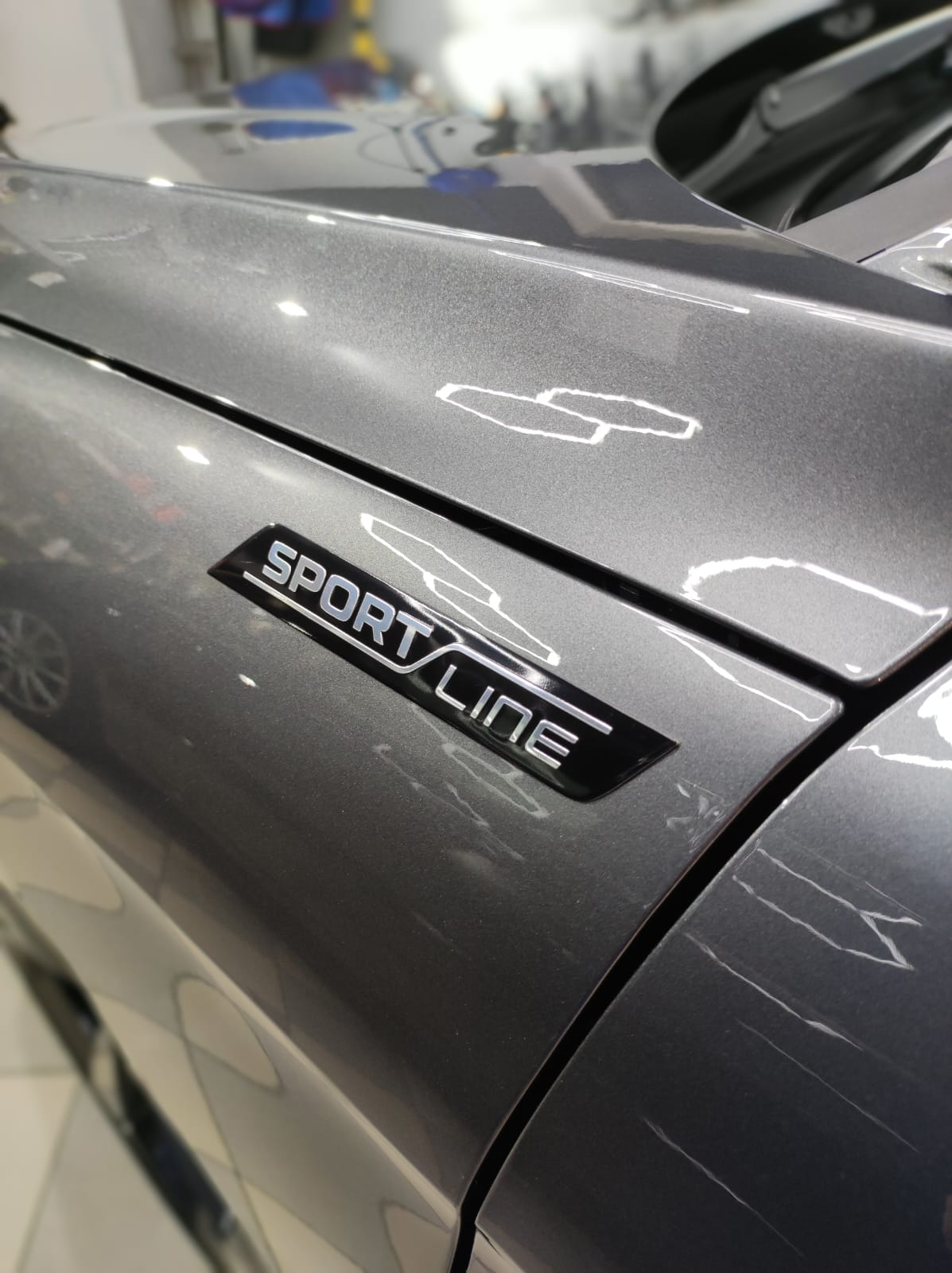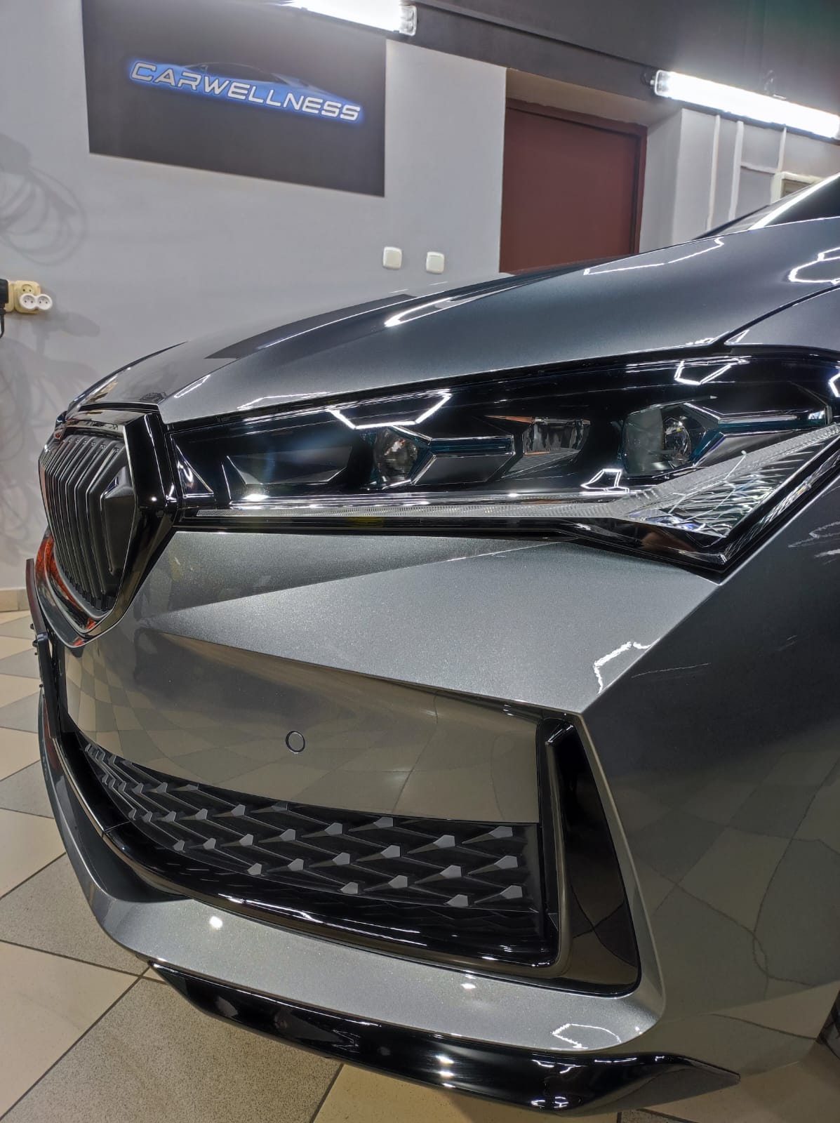 Przód samochodu – maska, zderzak, reflektory oraz lusterka – został pokryty folią PPF w pakiecie full front, co skutecznie chroni przed odpryskami kamieni, zarysowaniami i innymi uszkodzeniami mechanicznymi. Dodatkowo zabezpieczyliśmy progi oraz ekran multimedialny, aby zapobiec powstawaniu nieestetycznych rys w codziennym użytkowaniu. Cała karoseria zyskała ochronę w postaci powłoki ceramicznej, która nadaje głębi koloru, podkreśla połysk i zapewnia barierę przed brudem, solą oraz promieniowaniem UV. Dedykowane powłoki na felgach i szybach ułatwiają utrzymanie czystości i poprawiają bezpieczeństwo jazdy w trudnych warunkach pogodowych. We wnętrzu wykonaliśmy impregnację skór, co chroni je przed zabrudzeniami, przetarciami i przedłuża ich trwałość.
